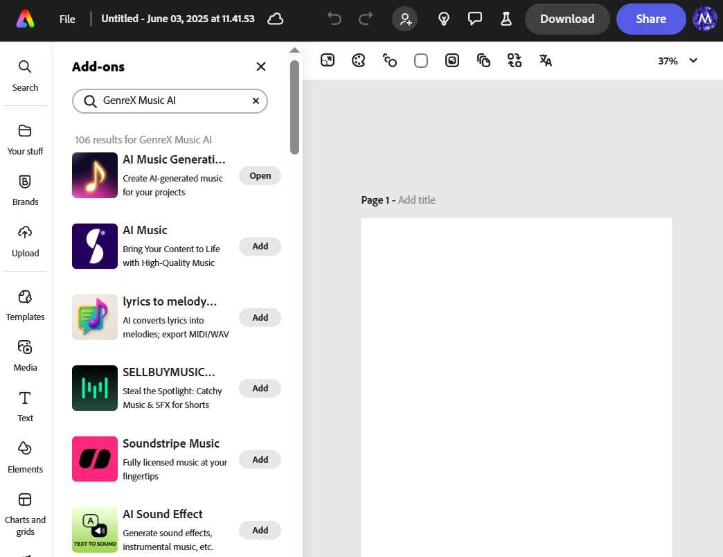 Genrex Music AI not showing on Adobe Express' Add-on search results. HELP!