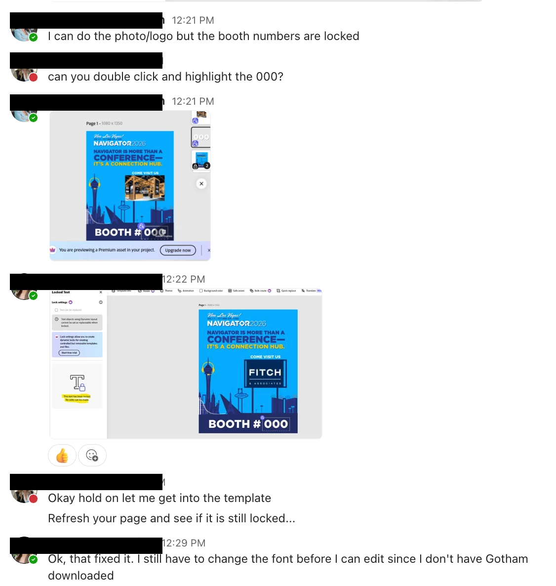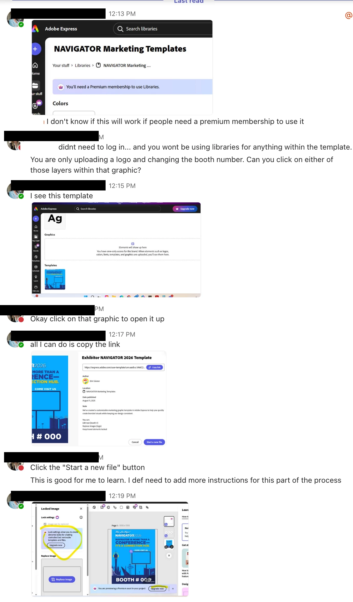 - Some users get a message that they need a Premium membership to use the template or access the library, even though they’re only supposed to replace the logo and booth number. Is there a way to share templates that avoids these premium prompts?