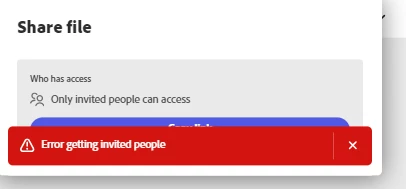 I am trying to share a file with my team and keep getting this error. I used an Adobe Branded template for the presentation and have had success sharing it to a couple of people before but now I am getting this error and cannot send to people that need it. Any known bugs or troublshooting advice to get this fixed?