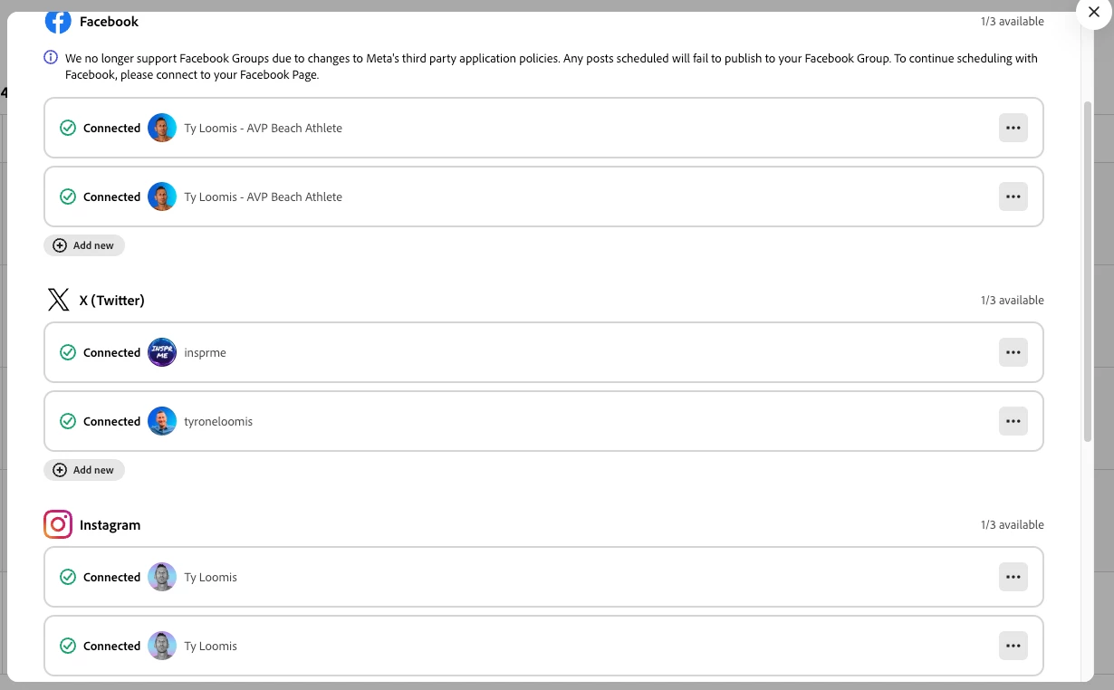 I am trying to sync my personal & business FB & Instagram accounts to Adobe Express Social Media Post Scheduler.