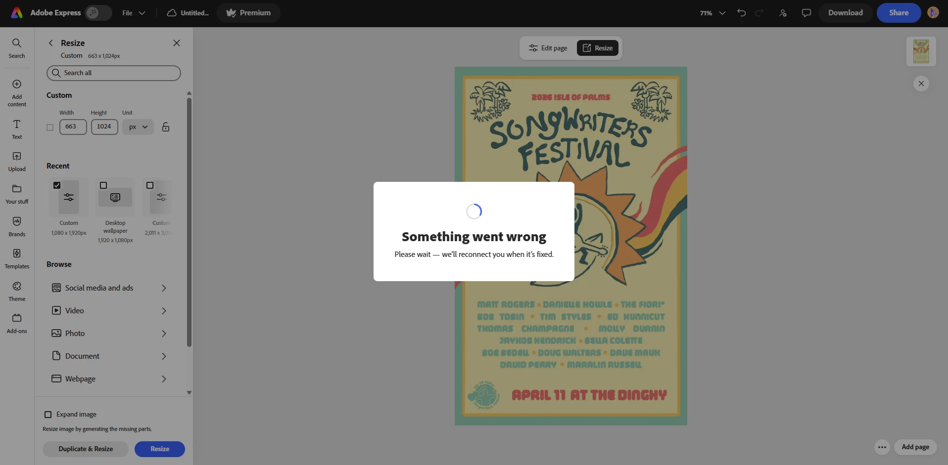 Loading the url: (https://new.express.adobe.com/) works, but when I go to create a new design or start from my content, I keep getting the message, “Something went wrong Please wait — we’ll reconnect you when it’s fixed.” A wheel then just constantly spinning and nothing loads so I can’t do anything.