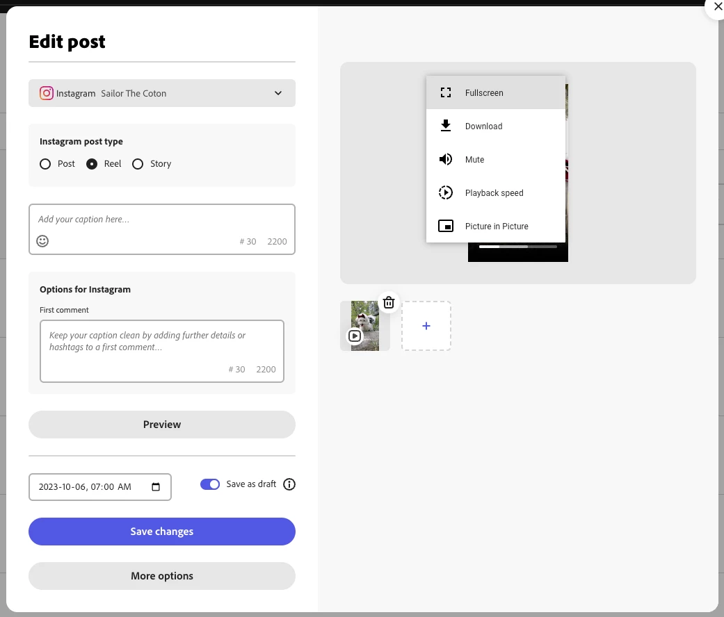 I'm looking to schedule a video Reel to an Instagram account and I'm seeing all the main elements, including "save draft", "Post Now", "Schedule", and "Preview", but I don't see an option to select or upload a thumbnail image for the Reel.