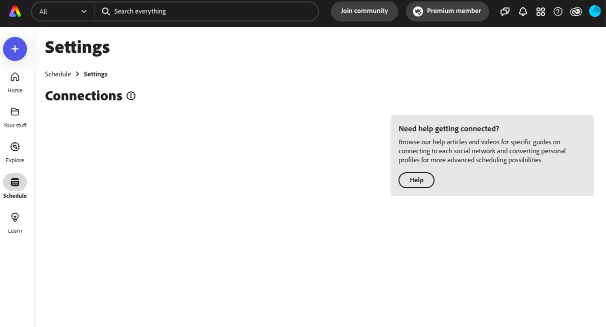 When I go to manage connections, there are no social media icons for me to click on to connected. I have business instagram accs and FB pages. I have also connected apple google and FB to my adone account just to be sure. PLease help !!
