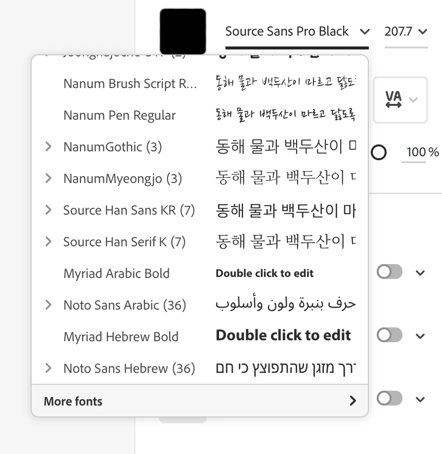 In the new font picker, fonts are grouped by language, not necessarily alphabetically. So you might not find Myriad Hebrew next to other 'M' fonts, but lower down in the list.