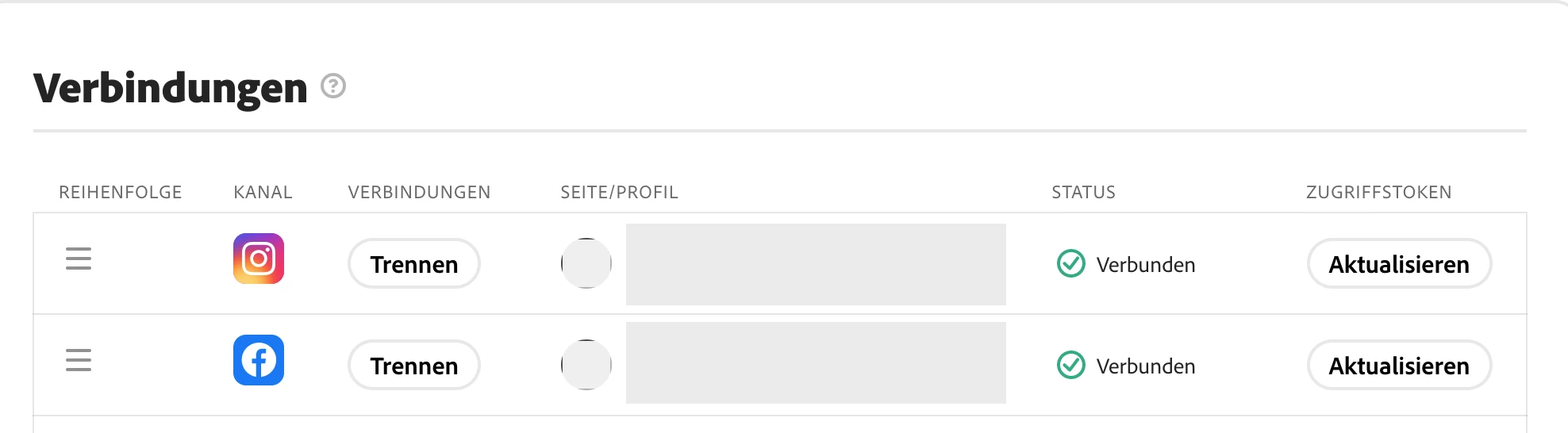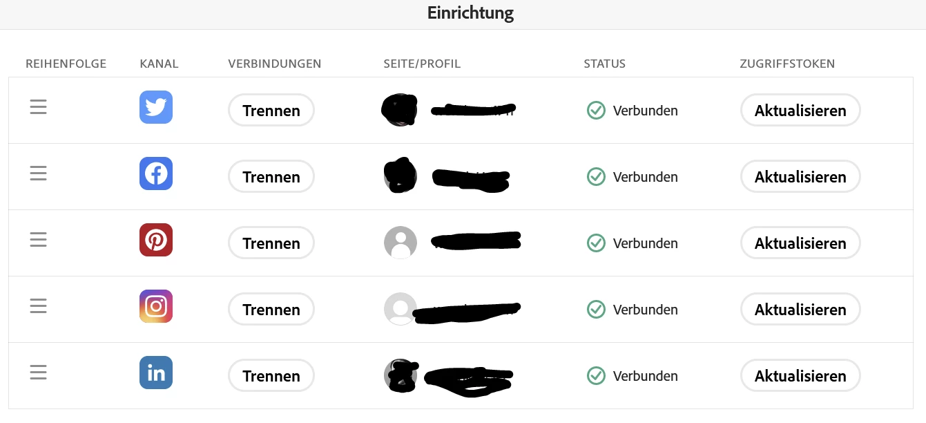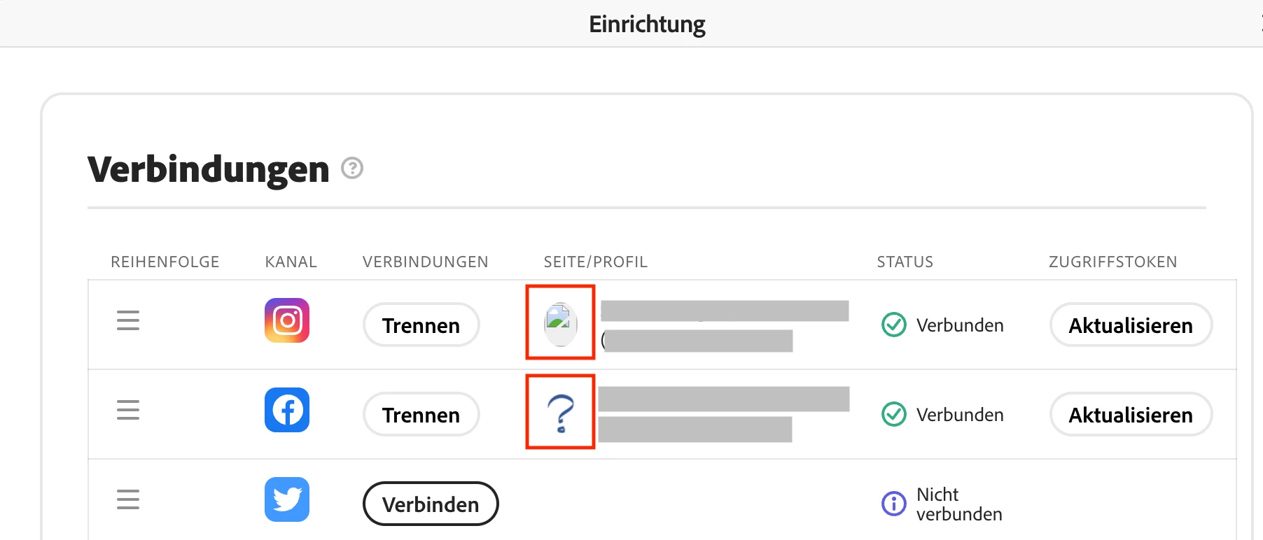 Nach einigen kleinen Herausforderungen (hier meine eine FB-Unternehmensseite) bei der Verbindung der Social-Media Konten mit Adobe Express, wundere ich mich über diese komischen Bildchen in der Übersichtstabelle zu den Verbindungen?