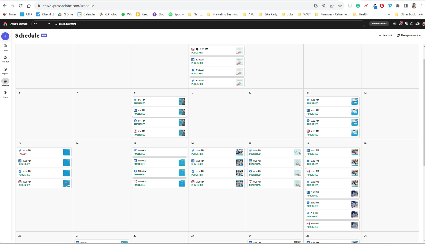 I also noticed that I can't duplicate a post anymore. So, if I've create my versions for FB, IG, and LinkedIn and schedule them, then I want to duplicate one to create a shorter version for Twitter -- NOPE. I have to start all over, re-upload the photo, re-enter the text, etc. Removing basic features like duplicating a post is not helpful, Adobe!!!