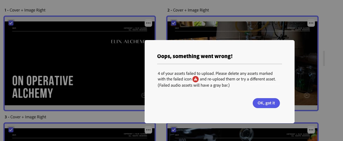 (number) of your assets failed to upload. Please delete any assets marked with a failed icon (ICON) and re-upload them or try a different asset.