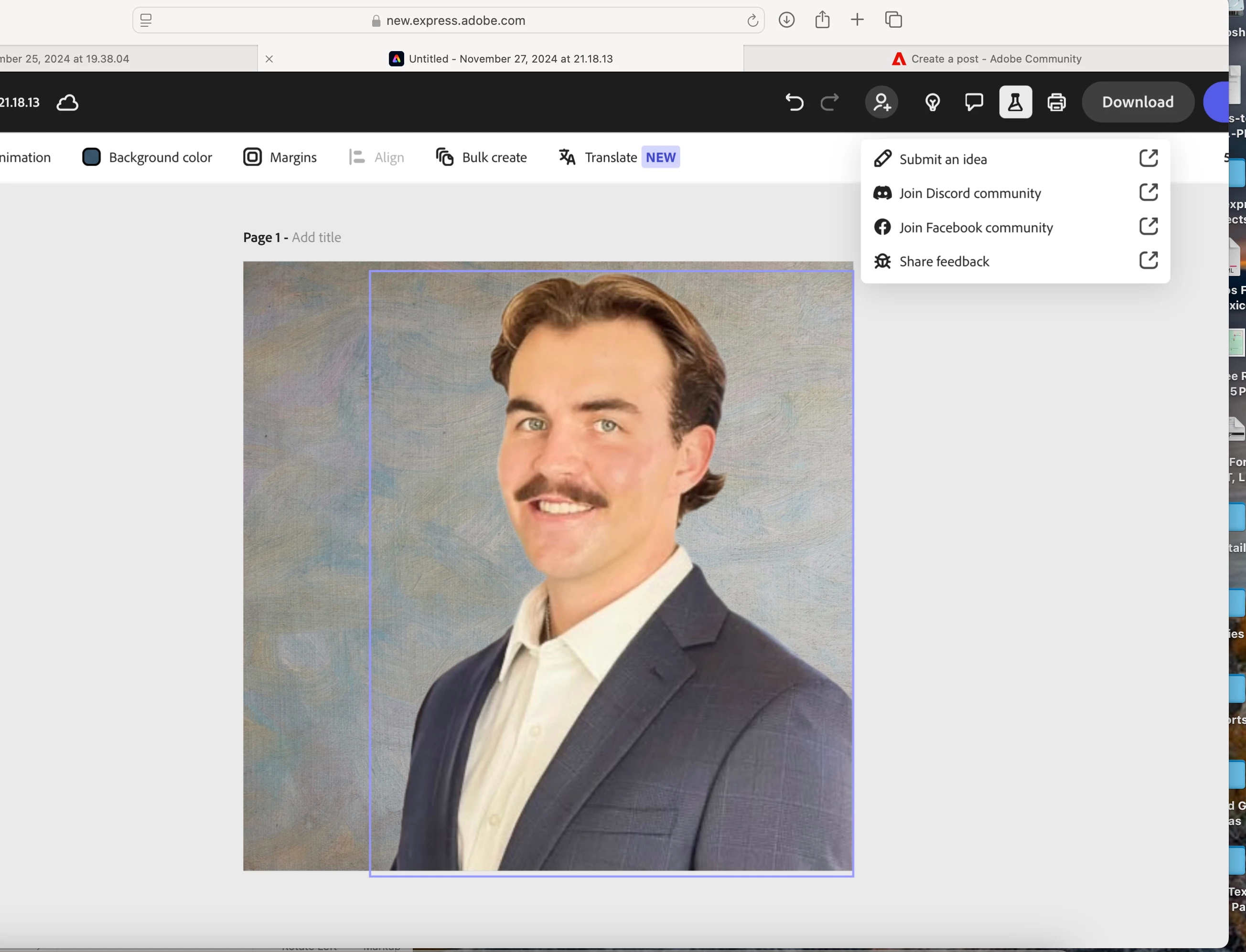 I'm on a MacBook Pro Safari 18.1.1 working on a simple project in Adobe Express to find a background for a portrait.