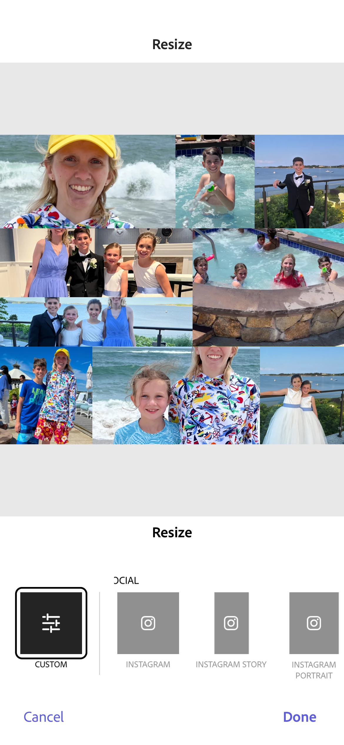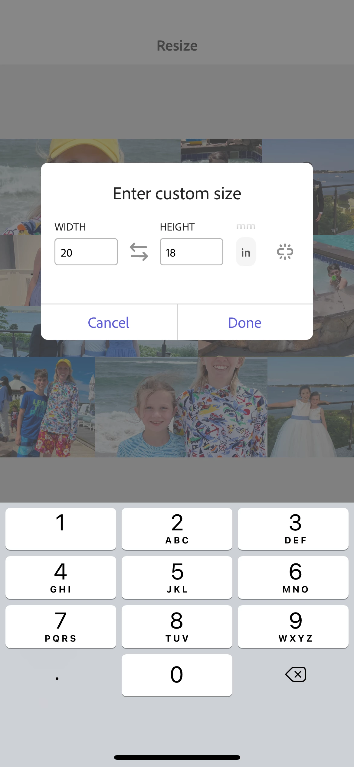 I am trying to create a custom photo collage using the Adobe Express app but I need it to be a custom size of 24 inches wide by either 16 or 18 inches high when I go to the resize option and I click on custom size for some reason the mobile app limits me to 20 inches wide