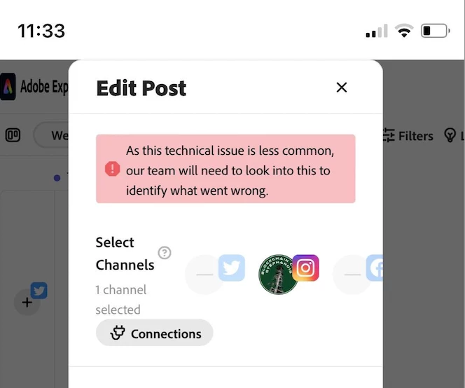 J'ai un problème avec la planification disponible sur creative cloud. J'ai respecté toutes les étapes avec un instagram d'entreprise liée à une page Facebook. Ma publication était prévu aujourd'hui a 11h30. A ma grande surprise le post n'a pas été effectué avec comme message d'erreur : "As this technical issue is less common, our team will need tilook into this to identify what went wrong"