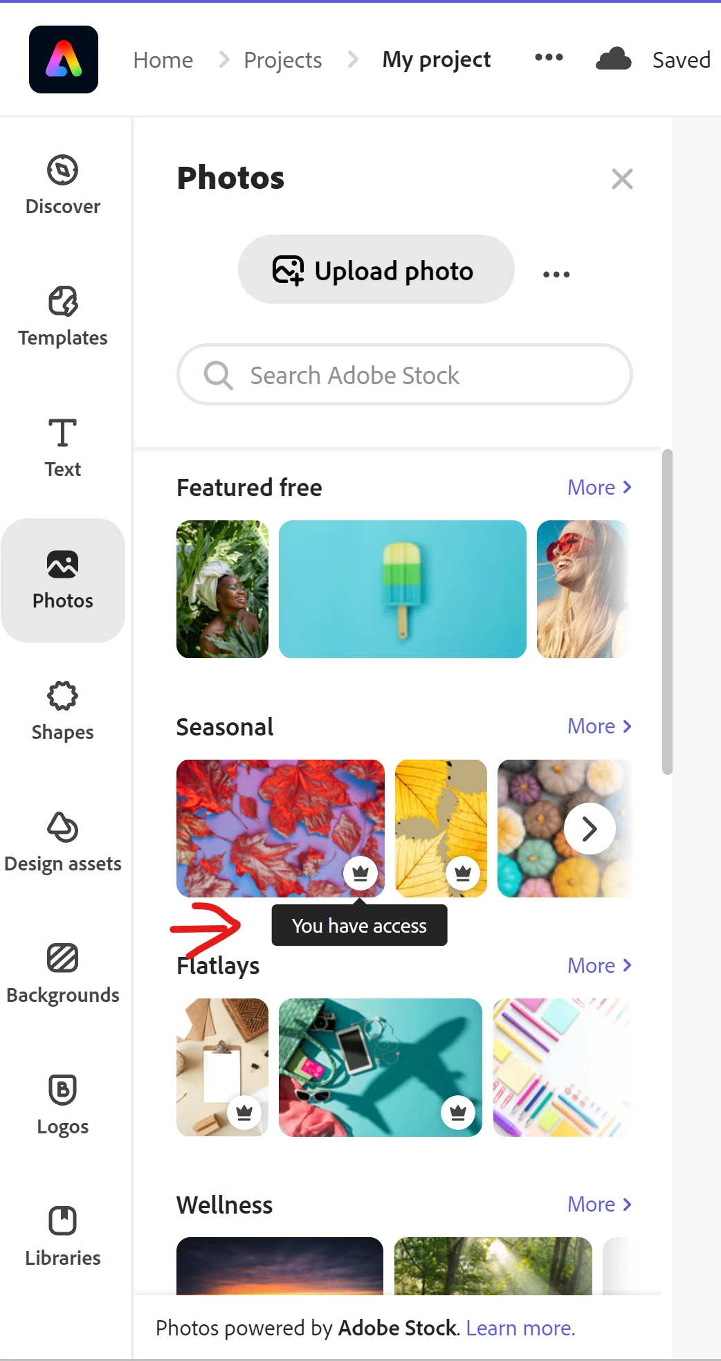 But I have a few questions about it. When searching for photos for the project, there is a crown icon, when I hover over it, it says "You Have Access" and when I click on them, it loads the project without any warning. Will I be charged for these later?