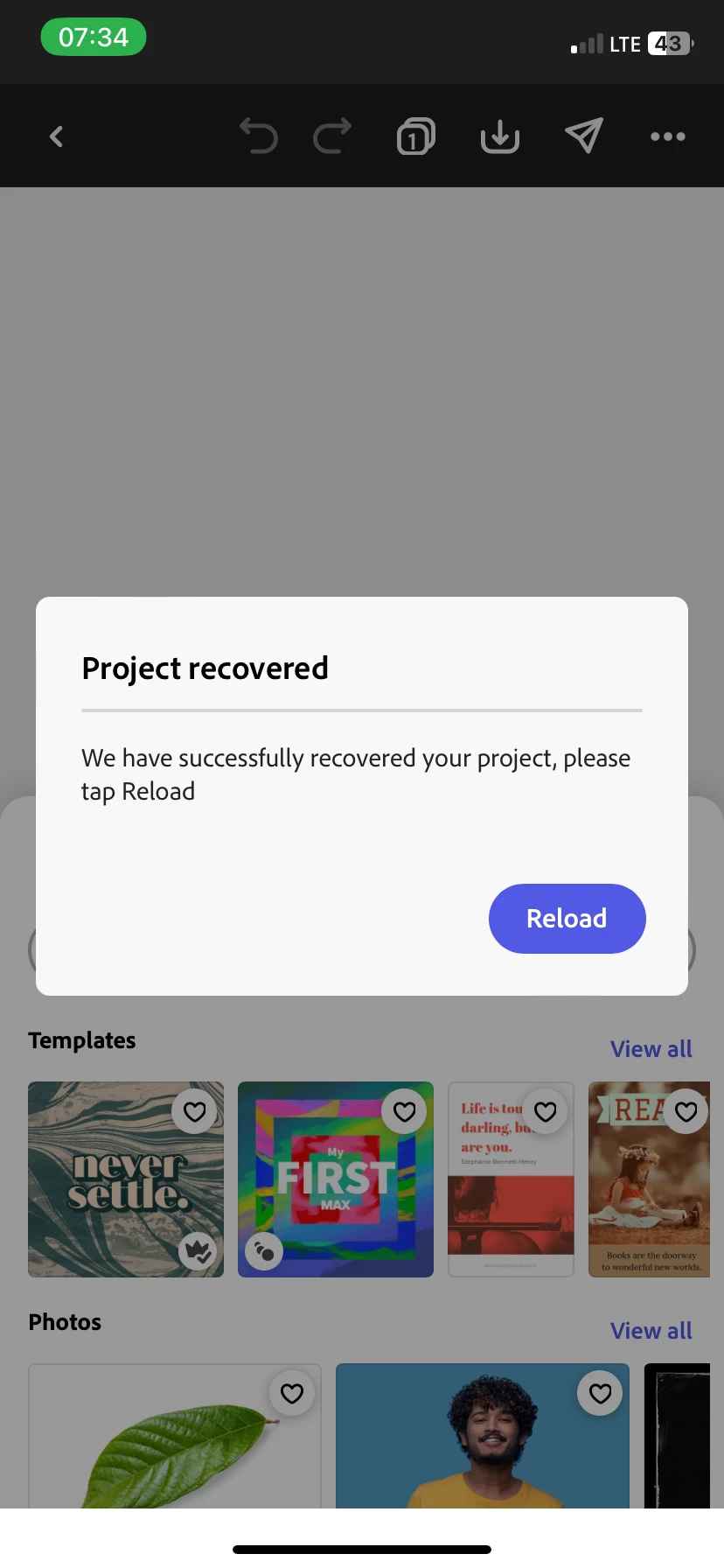 I want to design a flyer. I can view templates and other features but when I want to customize templates, click the plus button, or tap my projects, this notification keeps popping up. I have tapped on reload countless times but nothing. It would just start afresh and it would pop again