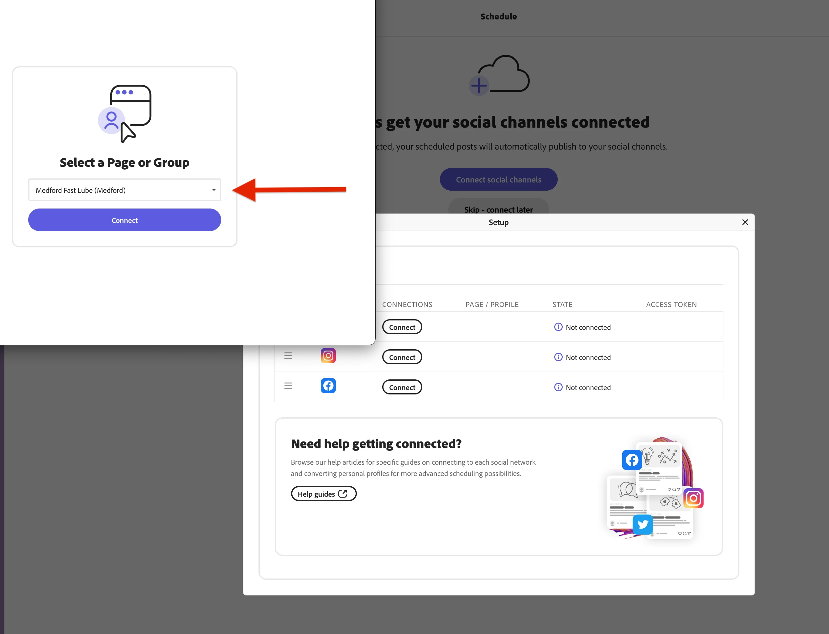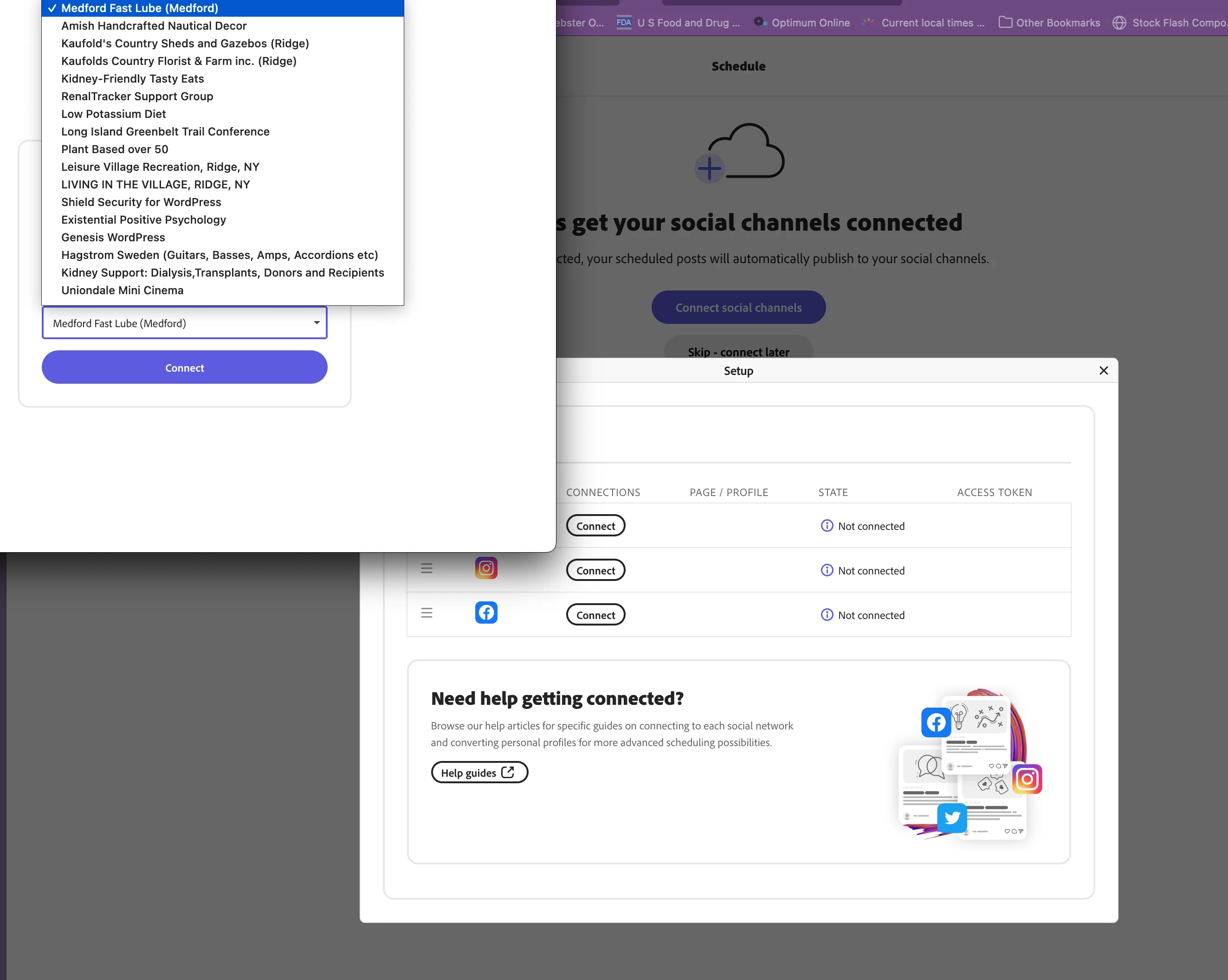 When I try to connect the Schedule to my Facebook page, the only choices that I get are my groups and customer pages from the pop up list, but I don't see my own timeline.