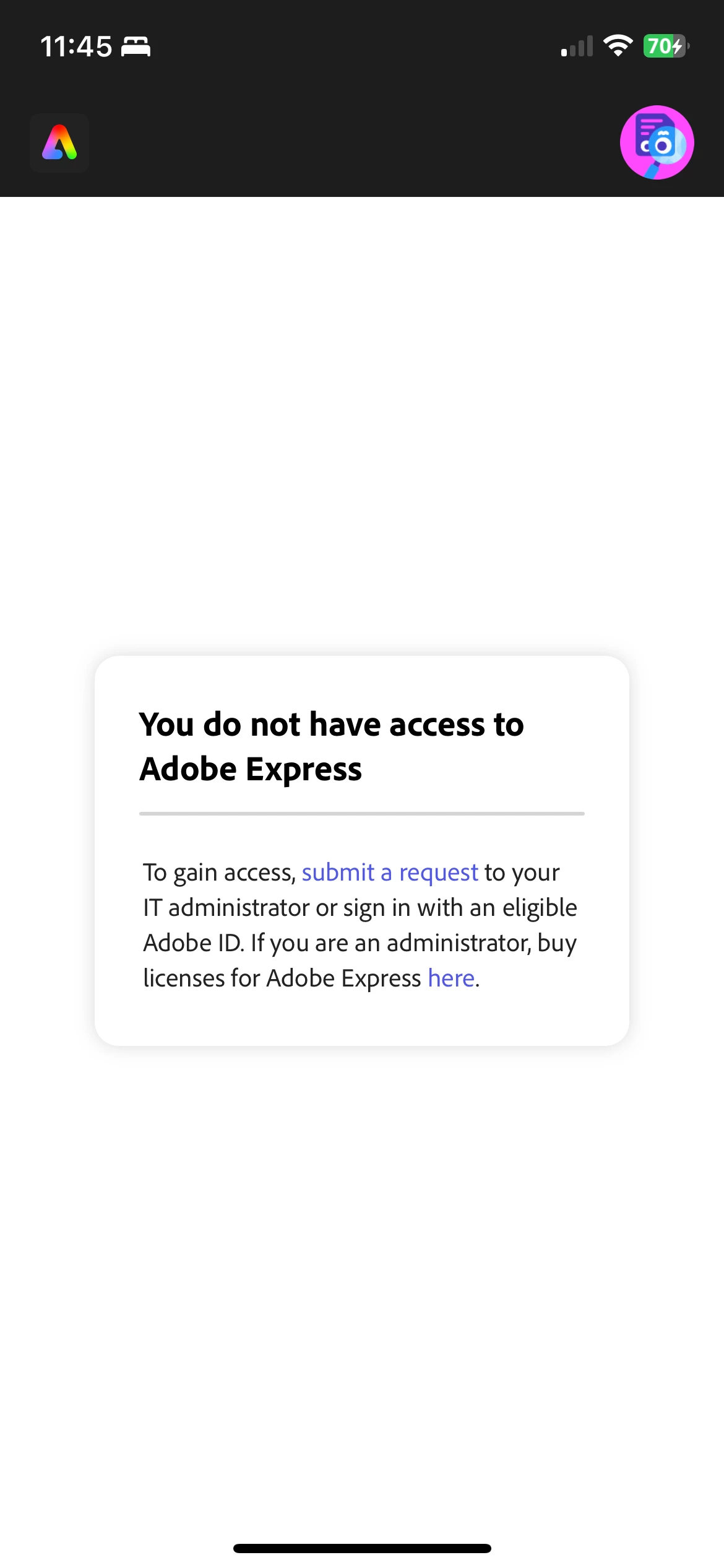 I have been using Adobe Express for a year or two now at this point. I am in charge of the social media of two social groups at my higher educations institution and I use Adobe Express to get my work done almost every single day. I have a lot of projects to be working on right now and so it is much to my despair that everytime I open the site/app I am welcomed with an error message stating "You do not have access to Adobe Express." I used my school's email with the understanding that I would have some sort of enterprise account access to Adobe Express and it has never been a problem until recently. Is Adobe Express not free to use? Why would I suddenly lose access to the program? It says to gain access I need to submit a request to my IT administrator but I do not even know where to begin to know who that is. Has anyone else had this issue?