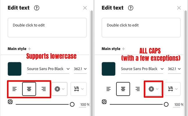 I've been using Adobe Express for a while now and find it great with a cloud subscription. But I have a problem. When I use a template that uses capitalized text because it is marked like this in Magic>capitalize & fit, but there is no way to disable it, it can be done by clicking next to drop cap but it is an option that I do not want either. I just want the letters to be lowercase and I can't. Of course, in the text box I use a font that allows lowercase and I write it in lowercase, but in the template it still appears in uppercase. This is very annoying because I write a lot of function names that can only be lowercase and it forces me to completely remove the template text and start from scratch. I don't understand why the deactivate capitalization option is not included or I am very stupid and I don't see it. If anyone can help I'd appreciate it.