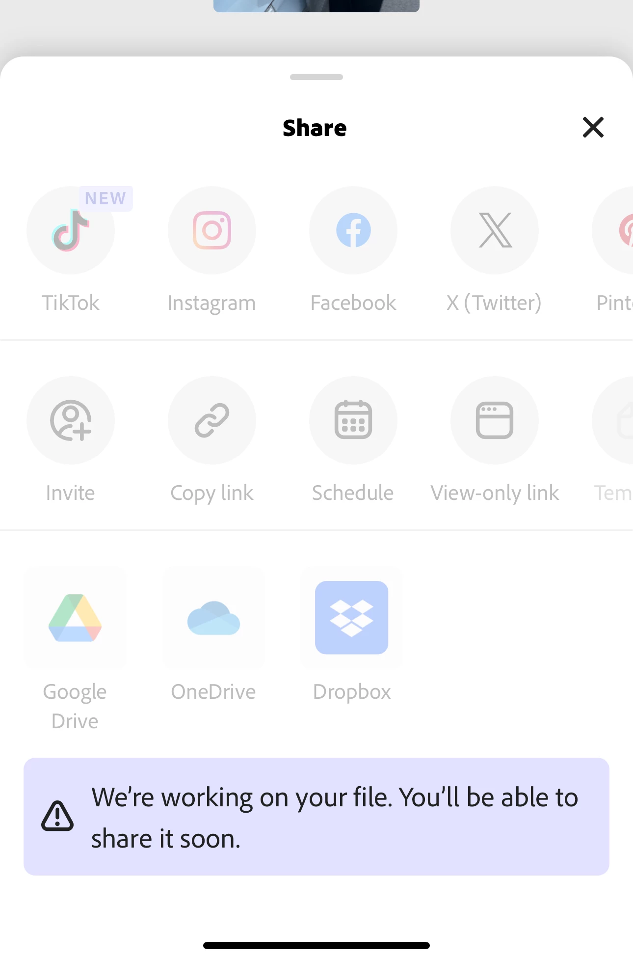 Im trying to share a file. When i go to the share button the next acreen just says adobe is working on your file. It just hangs on the screen and the file never becomes ready to share. Anyone suggest what might be going wrong.