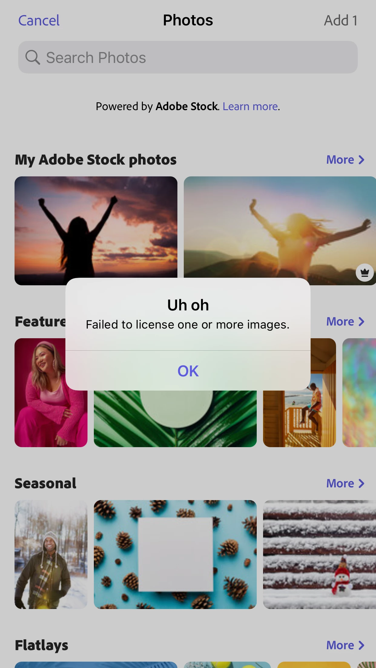 Uh oh failed to licence one or more images, this app was working fine a few hours ago which is very frustrating as I was on a creative streak and my creative role has hit a roadblock by this constant error, I've deleted, logged out, subscribe and unsubscribe and still the same error on something that has been deemed free, what on earth is going on, and there isn't a help chat option. This means the only thing I can do is post a message on this forum about what sort of company this can someone help me, please; please don't advise me to log out, delete and all that jazz as I've done that plenty of times today, thank you