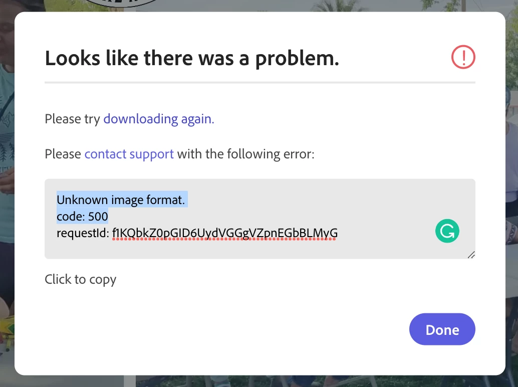 Unable to download PDF, unknown image format code 500 error