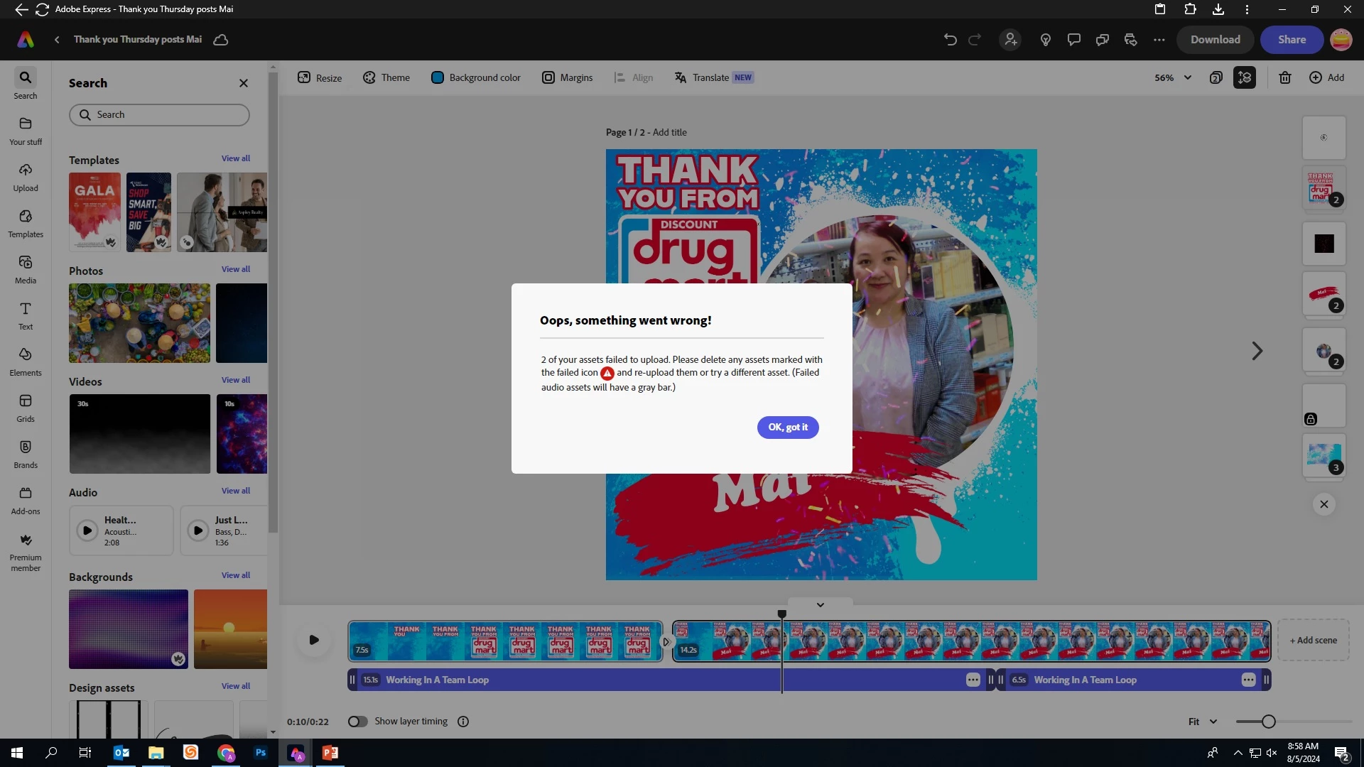 I go to download the video to show for a meeting this Wednesday and it keeps giving me the pop up of failed asset but there is no notification on any of the images that are used in the video that tell me what specifics they are.