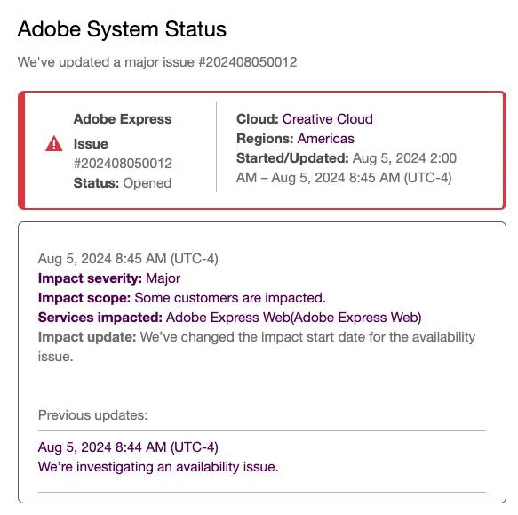 The major issue with Adobe Express as shown on the Adobe status page on July 31 has been closed: