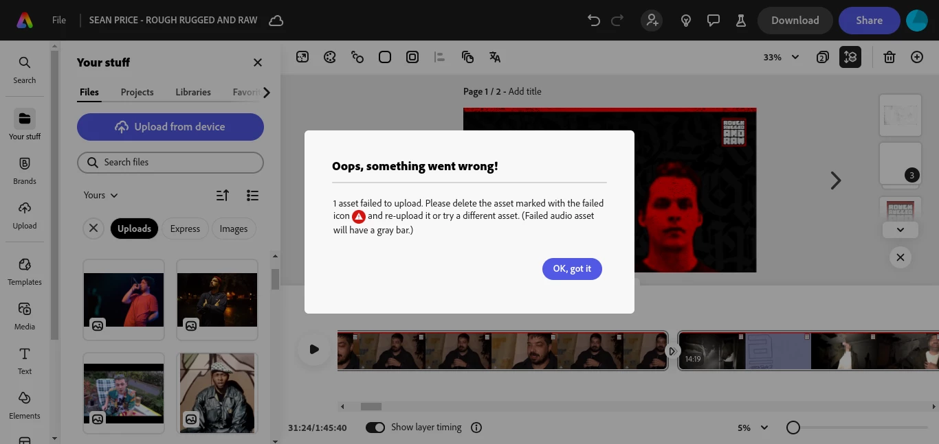So i have been working on an hour+ long video, and now i'm ready to download. However, i am unable to reaon being: "ione asset failed to upload. Re-upload or try different asset".