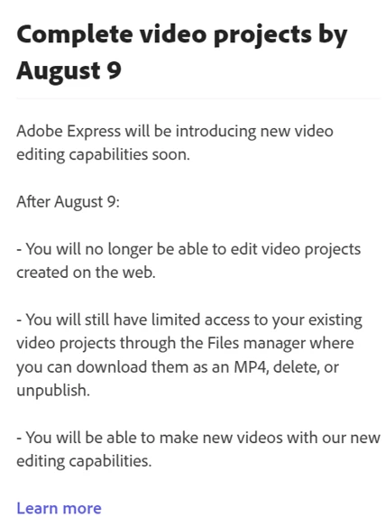 The message you received means that you can still edit your videos on the web version of Adobe Express, but the mobile version might have some limitations due to the recent updates. For the best editing experience, use the web version.