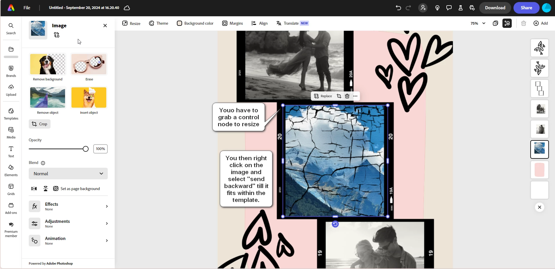 I can't find the way to zoom inn on pictures individually when creating a photo collage in the new version of adobe express App! 😓