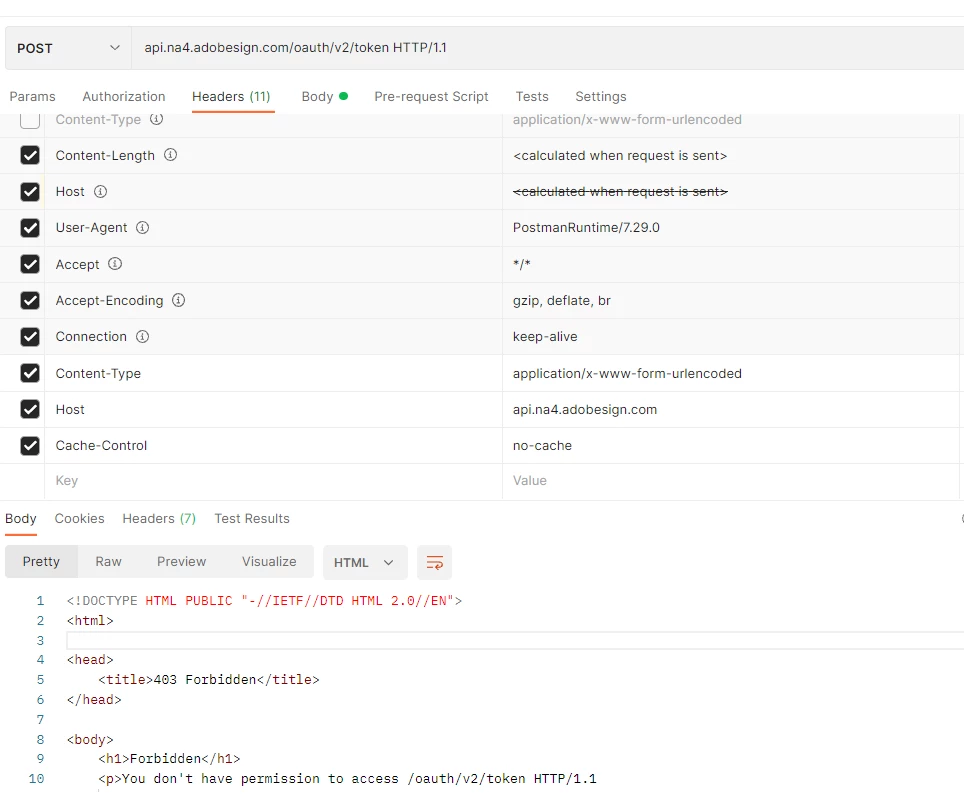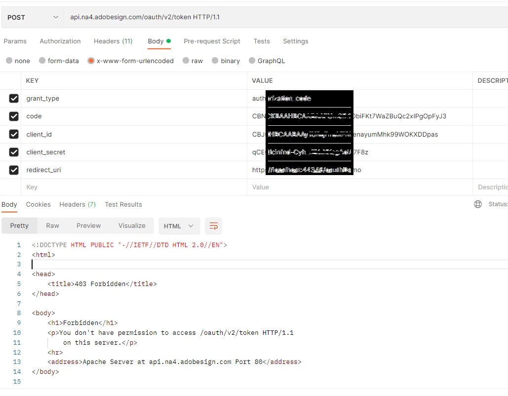 Question: While I can successfully generate the CODE, why I am not able to generate the access token as mentioned in the official article Acrobat Sign (adobesign.com)