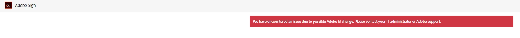 "We have encountered an issue due to possible Adobe Id change. Please contact your IT administrator or Adobe support."