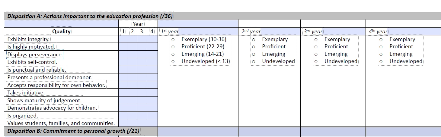 I'm in the process of digitizing a self-evaluation form that my students fill out each year during their undergraduate program. The form asks them to enter a number between 0 and 3 in several categories, and their total score is then associated with a rank (emerging, proficient, etc.). Since I am going through the process to make it a fillable PDF instead of a pen-and-paper form as it has been in past years, I'm wondering if a formula can be added so the numeric sum are automatically calculated (per year) as the students fill in the form (see a screenshot of the original form):