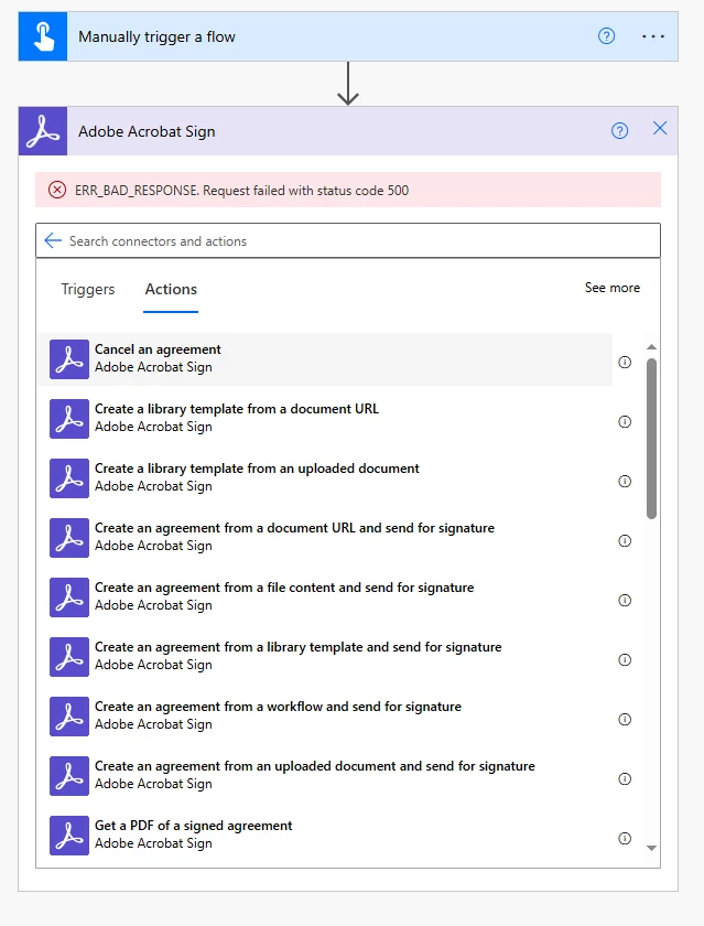 Adobe Acrobat Sign Connector addings in Power Automate Error - ERR_BAD_RESPONSE. Request failed with