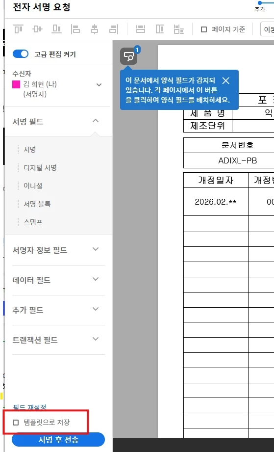 Adobe Acrobat Sign 프로그램을 사용하고 있습니다. 해당 프로그램을 통해 전자 서명을 진행하고 있는데 앱을 통해서 전자 서명을 요청하다보면 좌측 하단에 [탬플릿으로 저장] 하기 버튼이 활성화 되어있는것을 확인할 수 있는데 이렇게 저장된 탬플릿은 어떻게 사용하는 것인가요?