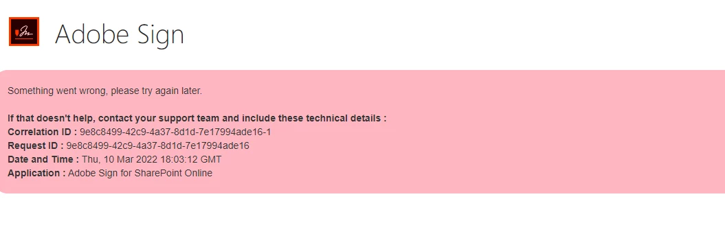 We are using Adobe sign integration with SharePoint and are now getting below error. I have looked up the forums and two other folks have posted same issue but no one replied or the problem never got resolved.