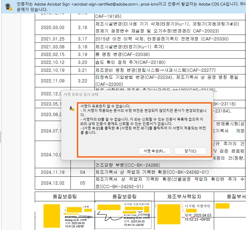 제가 서명한 디지털 서명은 [서명이 유효함]이 확인이 되는데 제가 아닌 다른 두분이 서명한 디지털 서명은 [서명이 유효하지 않음] 이라는 메세지가 뜹니다.
