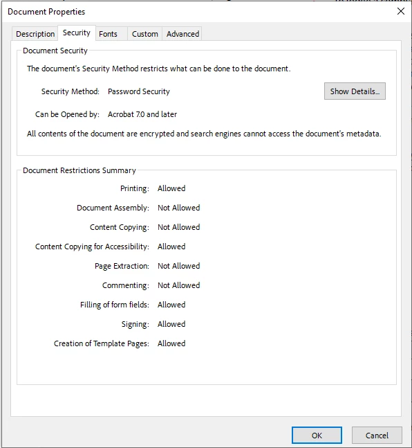 Our customers have signed up to Adobe Sign and use that to send out our forms to request signing but when they come to select the files to request e-signatures, the error message ' This document is a secured filed and cannot be e-signed.' is poplulated. The security settings for the forms don't allow changes but do allow filling in and signing forms.