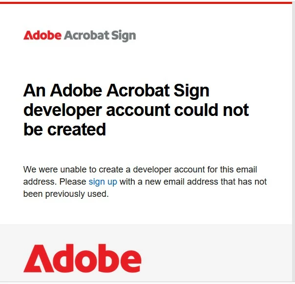 I am trying to create a developer account on adobe sign API. I have filled in the form on the page https://www.adobe.com/acrobat/business/developer-form.html but 5 minutes later I received letter like this.