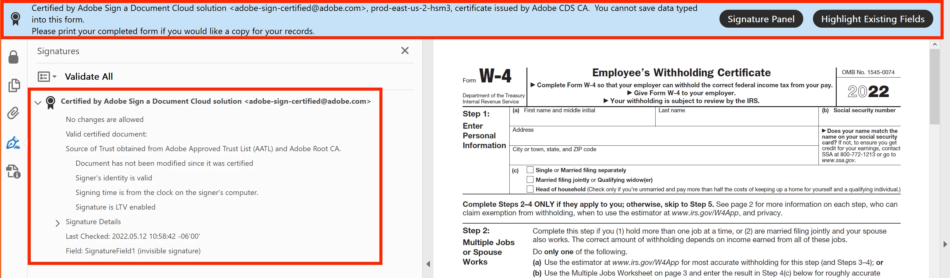I'm attempting to validate some PDFs created by the Adobe Sign service (sent from the Adobe Sign web app), specifically I am trying to figure out if I can validate the "Certified by Adobe Sign a Document Cloud solution..." message/security seal without having to open the PDF in Adobe Acrobat.