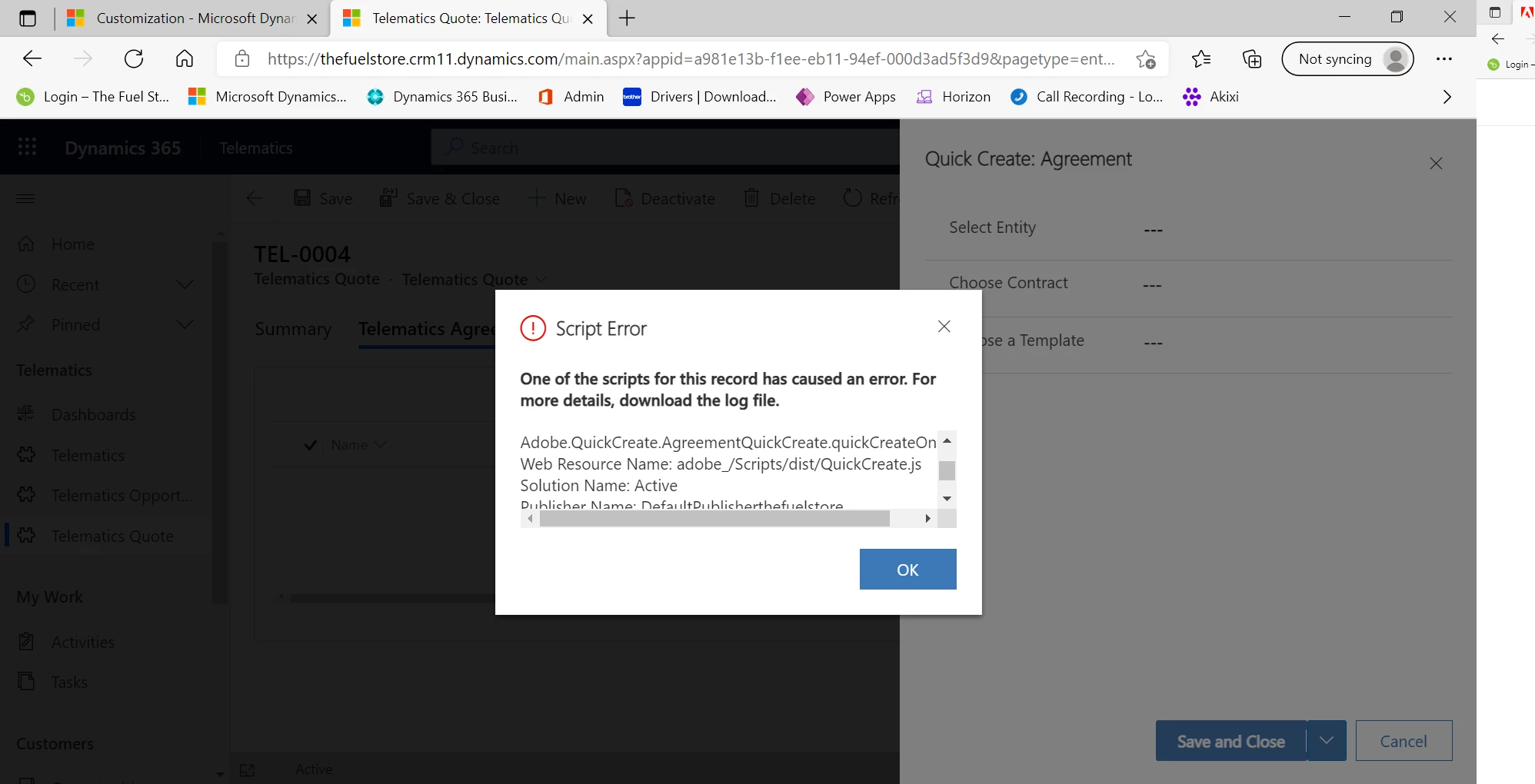 I encounter a Script Error Message when the quick create agreement form appears. Can you advise on how this can be resolved please ?