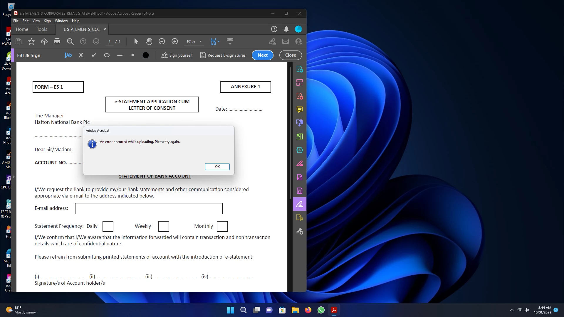 Hi, I'm this popup message while I'm trying to signup my document and saving it as E-Copy.