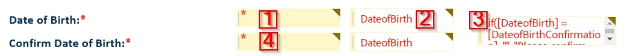 Text tag for this comparison field: {{!ea_DOBMatch:calc([eaDateOfBirth_es_] = [eaConfirmDateOfBirth_es_],"","Please confirm and correct the DOB as these fields do not match."):font(color=FF0000)}}