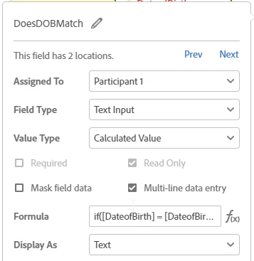 3.)DoesDOBMatch – This is a read only field displaying a calculated value as text. This looks at fields 1 and 4 from the initial image and checks to see if they equal one another. There is no true message, just double quotes, but the false message is noted in the formula.