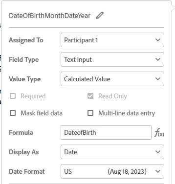 2.) DateOfBirthMonthDateYear – This is used as a read only display of the users DOB. Utilizing a formula calling the first DOB entry and displaying it not in the original mm/dd/yyyy it was entered in, but as you can see, displayed as a date with a date format of US so it displays ex: Aug 18, 2023.