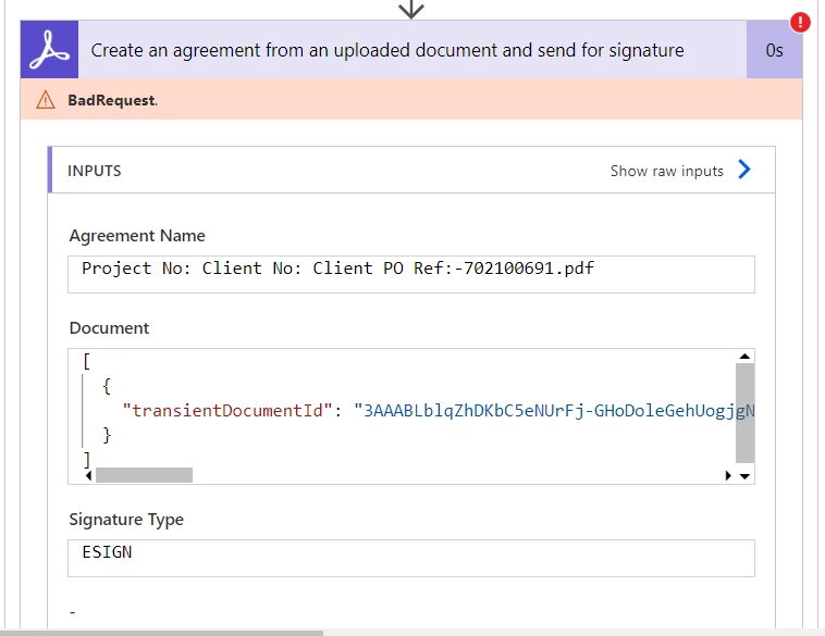 Despite doing a string compare on the document ID and name, the action in power automate keeps coming up with this error and won't send the document out for a signature. I've updated the connection by signing in again but nothing seems to work. Any help would be appreciated.
