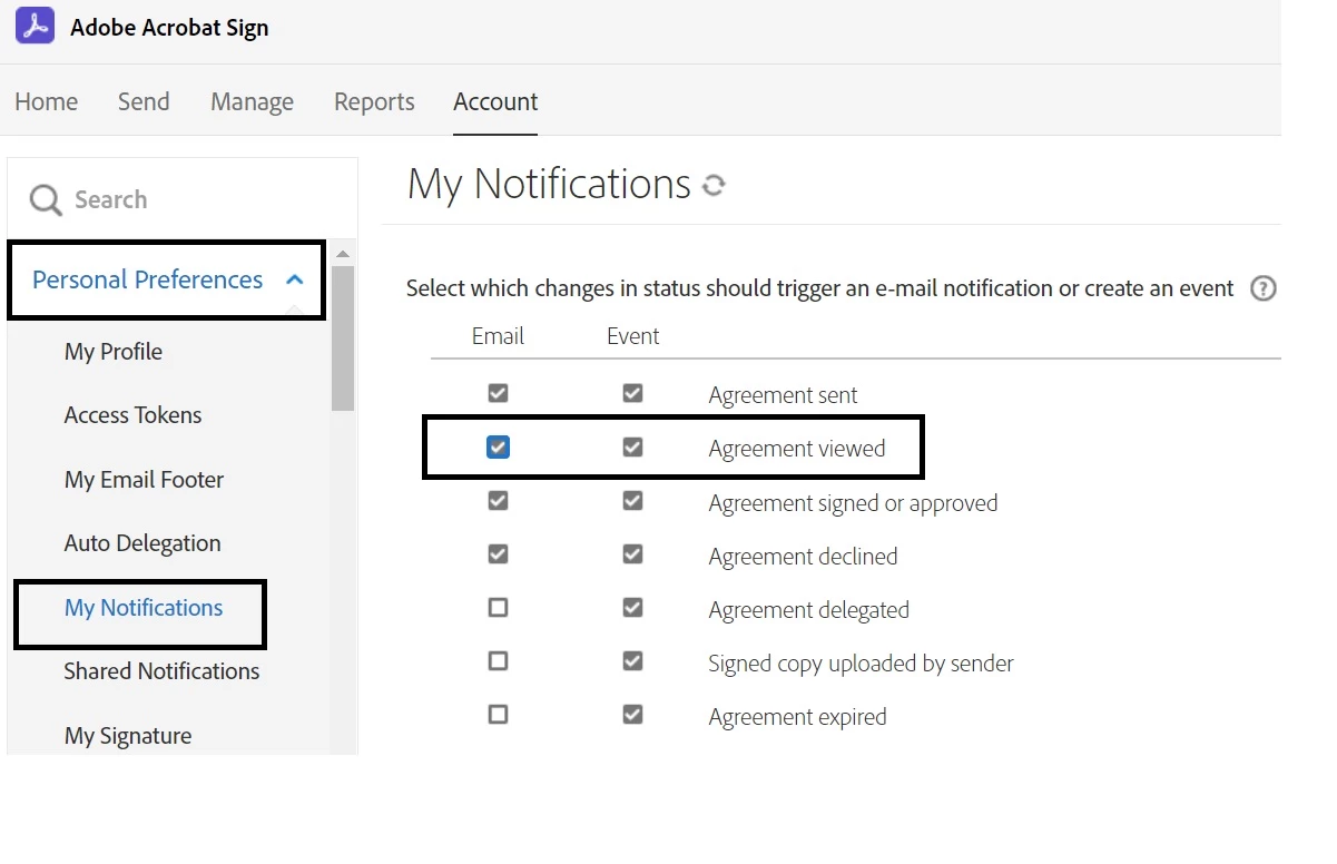 Where do you find the settings to have Adobe E-Sign notify (email) me when a recipient views a document (the way DocuSign does)?
