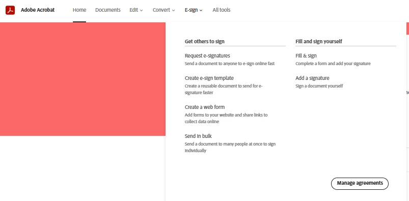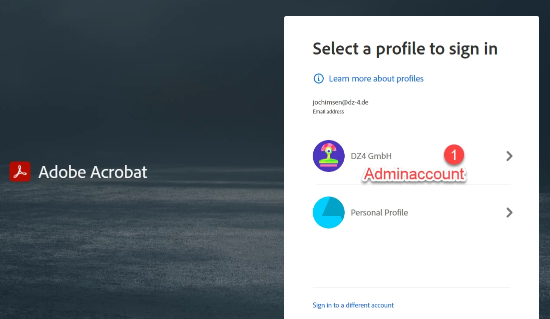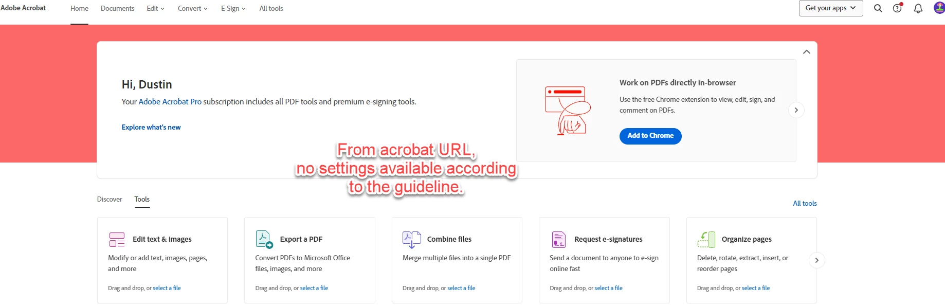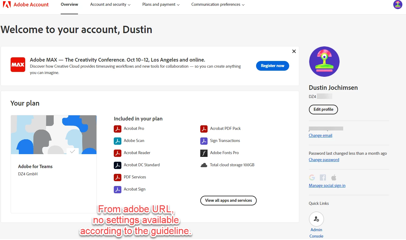 It almost the same looks like trying to find the setting when using another account for a seperate contract "Adobe Sign" which is handled with a different Admin Console and login.
