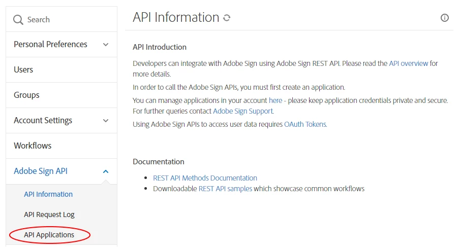If you go in your account parameter, you will see "Adobe Sign Api" section like :
