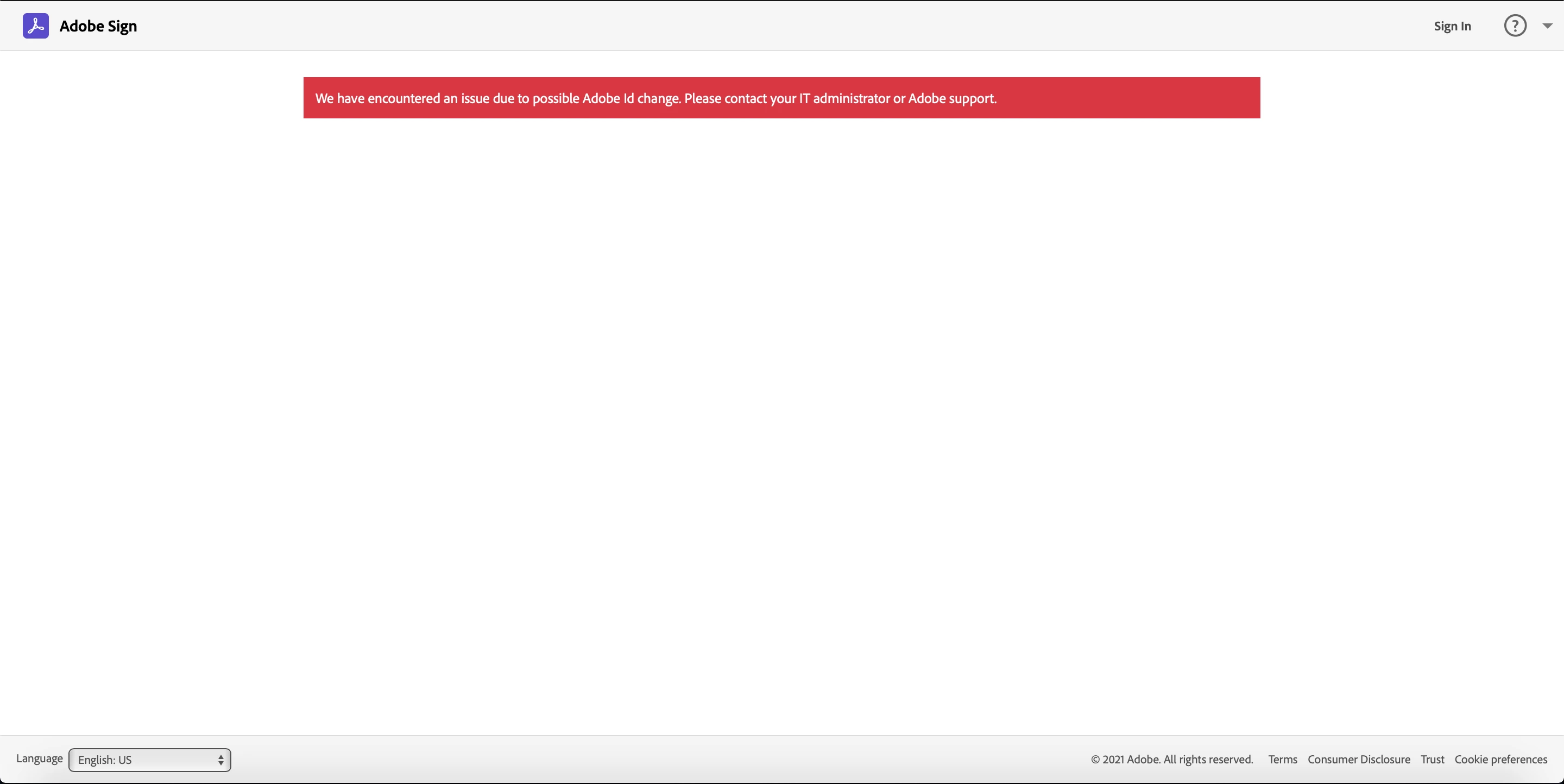 When trying to sign in to: https://secure.echosign.com/public/login as soon as I type my ID in and then attempt to type my password the page immediately redirects to a personal adobe account login page thats diferent from the echosign login page as if the ID is still linked to a personal adobe account. If I attempt to sign in on this page it says: