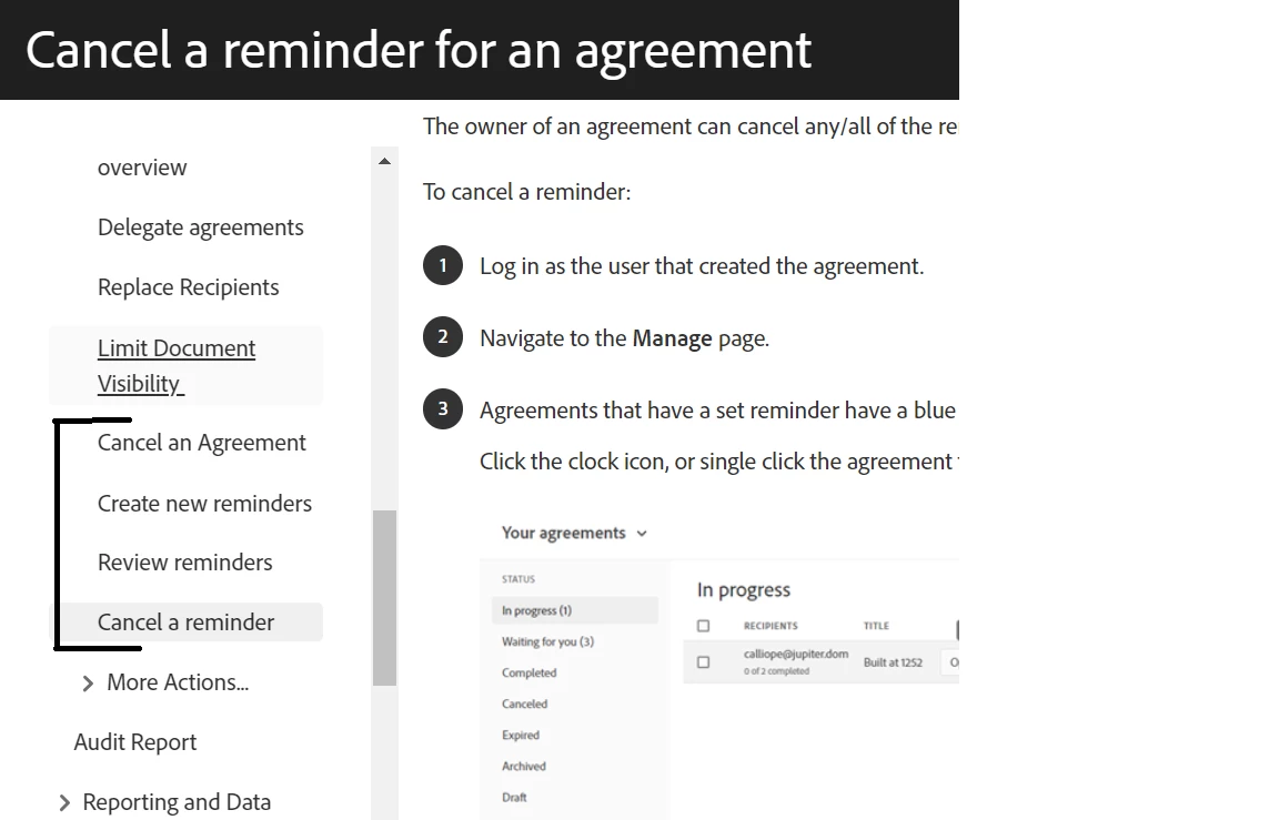 I canceled an agreement because the signer ended up stopping by the office and signing. I went into AdobeSign and canceled the agreement, but it still shows it is "in progress". When I open it, there is no cancel link and status says it is canceled. However, it continues to send reminders and I can't stop it. If I click the link from the email reminder, it says the agreement was canceled. If I try to click the reminder button, it freezes up and doesnt go anywhere. This has been going on for a week now.