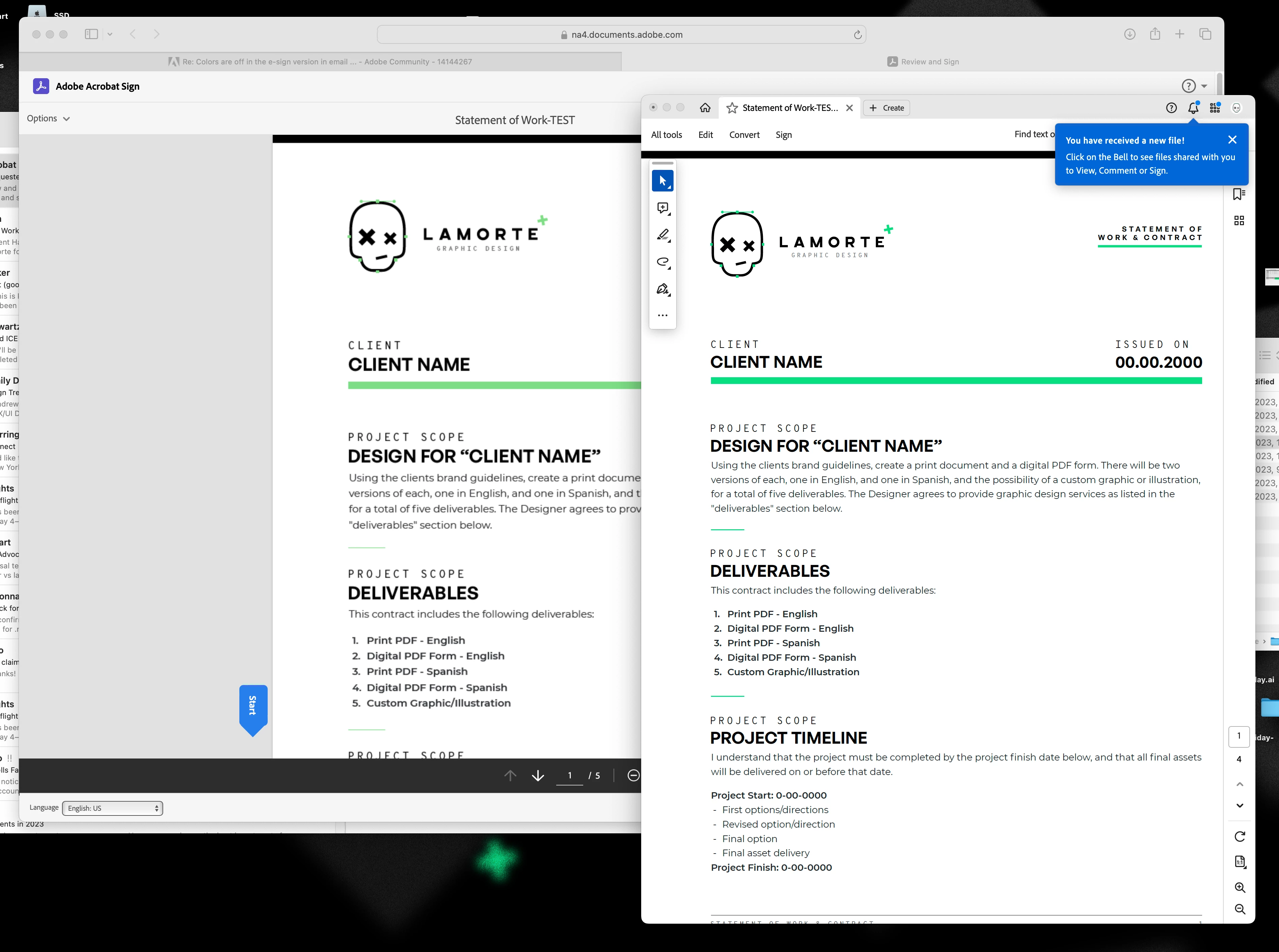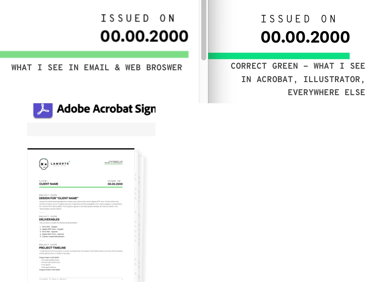 I have created a PDF in Illustrator, then opening it in Acrobat to prepare are form. When I send the form out to request a signature, the color of the green that I am using is way off. I can see this in both Safari and Chrome, and the PDF thumbnail in my email is also off. Everything looks correct in Acrobat.