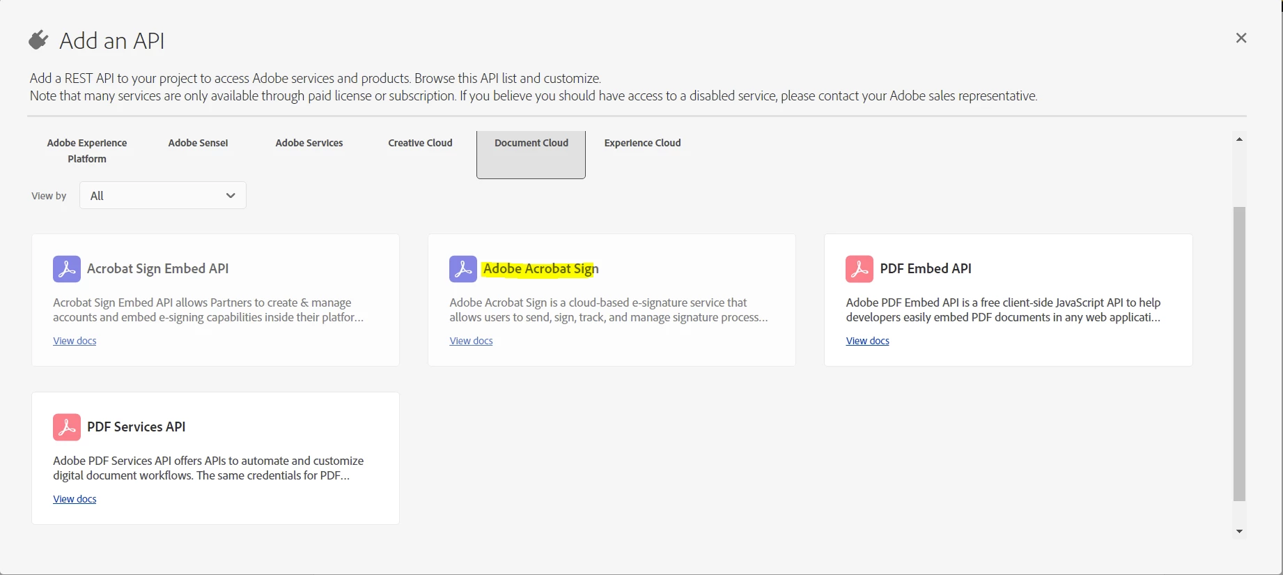 4. Noticed that some APIs are grayed out, including the Adobe Sign API, preventing me from adding it.